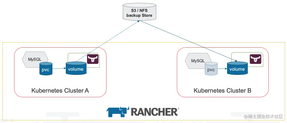 在这篇文章中,我们将把MySQL作为Pod部署到集群A中,并使用Longhorn作为持久化存储卷,然后依托Rancher多集群管理的特性,结合Longhorn的容灾备份功能,演示一下如何优雅地将集群A中的MySQL应用及数据迁移到集群B中。