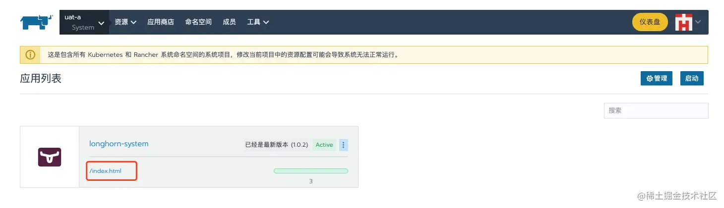 在Rancher中,进入集群A的system项目,在应用商店中可以一键启动Longhorn。