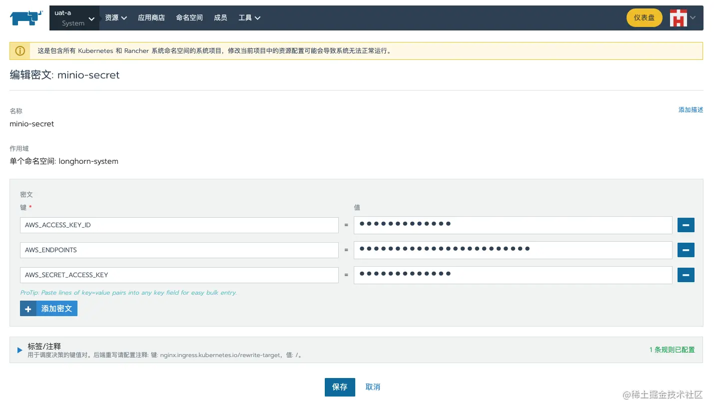 访问Rancher,进入集群A的system项目,选择 资源 > 密文 菜单,在longhorn-system 命名空间中创建访问s3的secret,需要增加的参数包括: