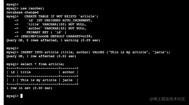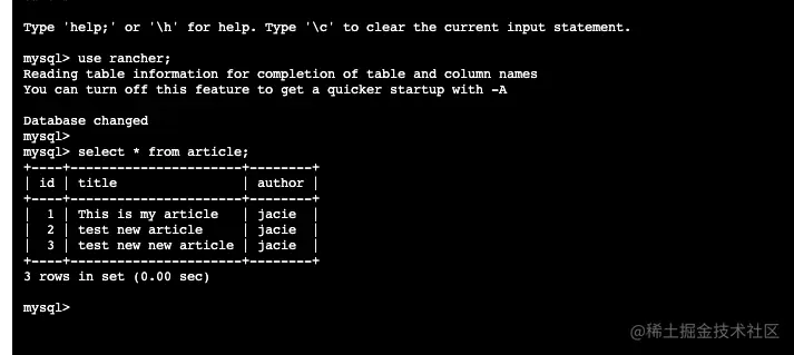 在集群A中部署一个MySQL应用,并在MySQL中创建测试表article并插入一条数据。