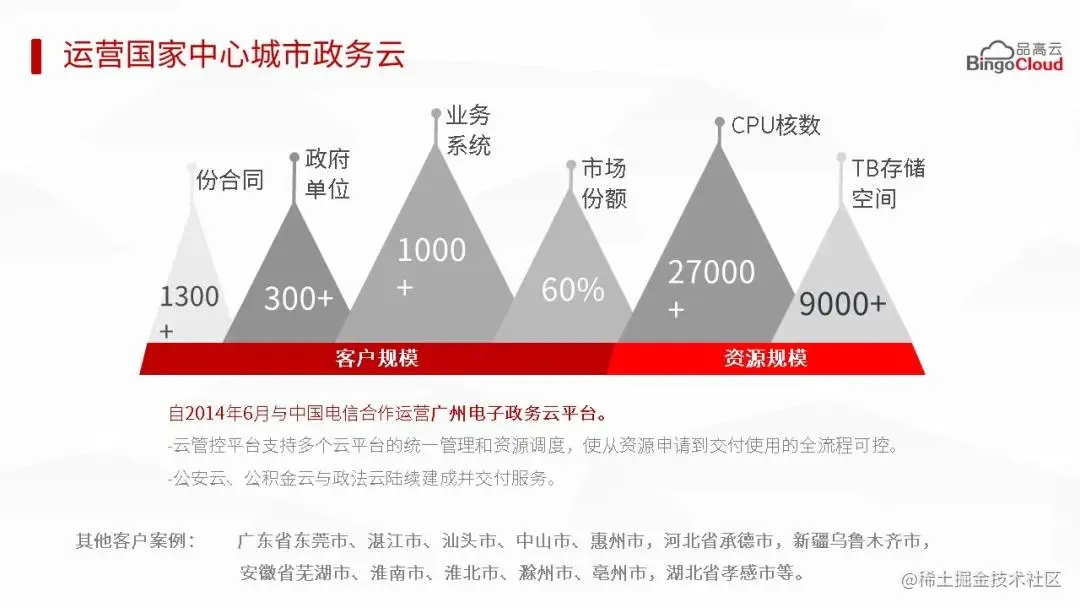 从2014年至今,其已为广州市包括政务、公安、公积金、政法、医疗以及教育在内的300多家政府单位提供了虚拟机4000+台,物理服务器2000+台,总CPU核数达27000+个,存储总量9PB以上,云平台上运行的业务系统超过1000个。