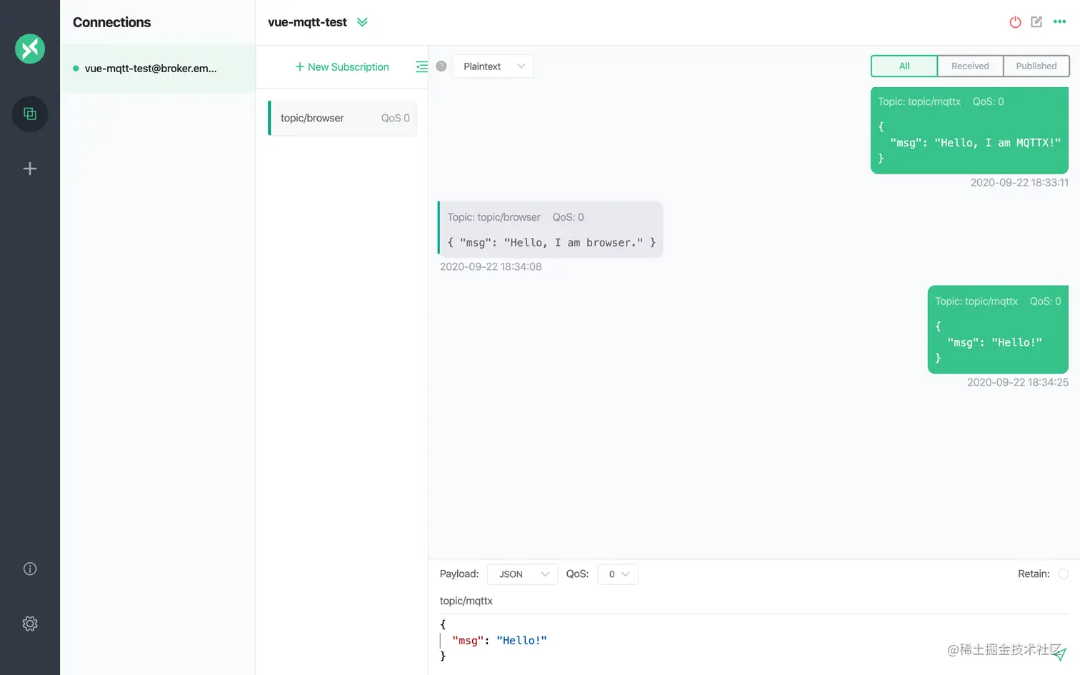 我们使用 Vue 编写了如下简单的浏览器应用,该应用具备:创建连接、订阅主题、收发消息、取消订阅、断开连接等功能。