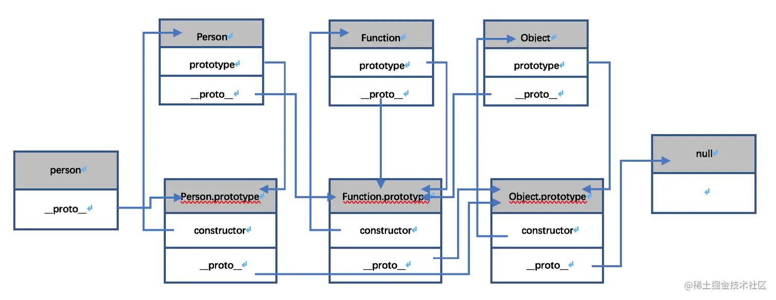 5)prototype也是一个对象,它是Object函数创建的,所以prototype的__proto__指向Object的prototype。