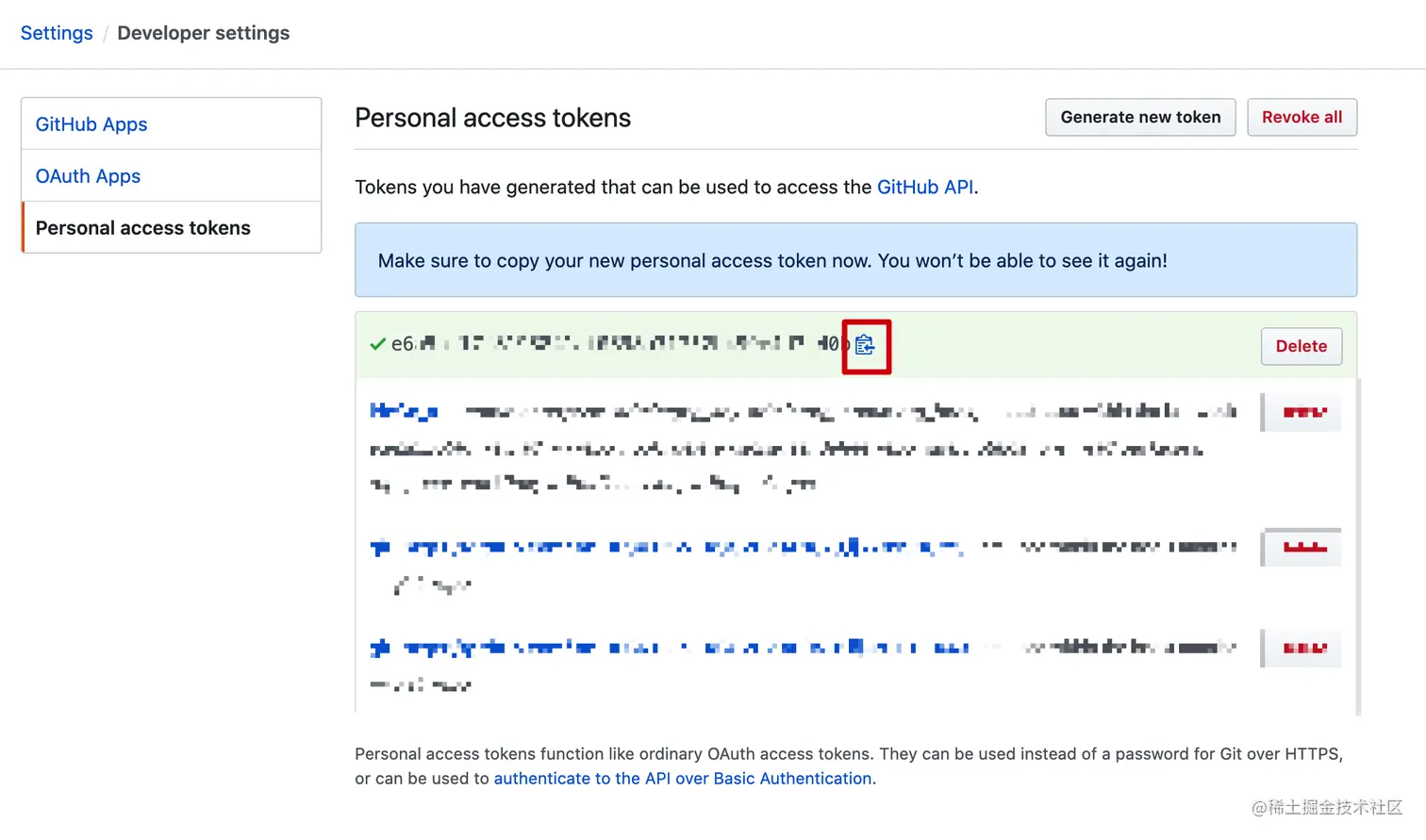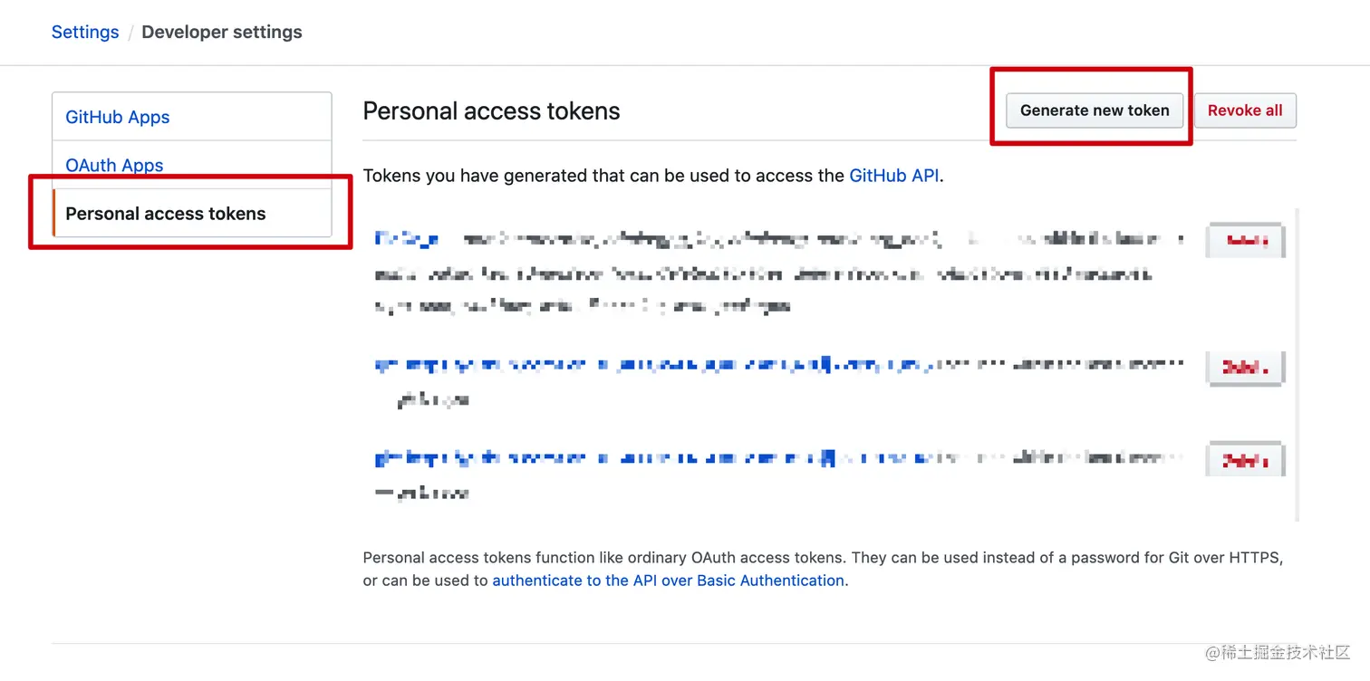 点击 Personal access tokens 再 Generate new token 新建 token 。