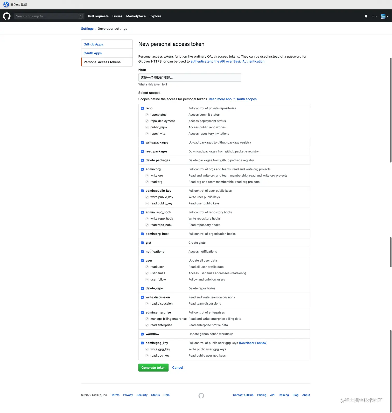 填 Note (随便填写即可),勾选所有复选框 ,到页面底部 Generate token 就完成了;