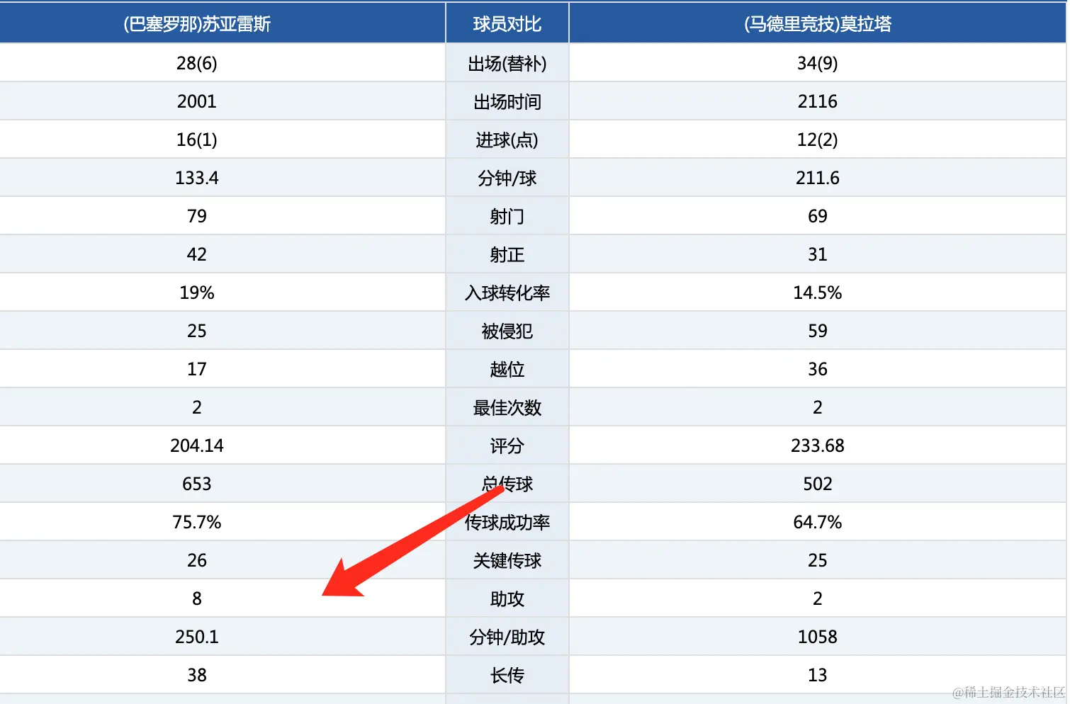 这里我们抽取中锋最重要的两项数据,进球数和进球转化率,可以看到在进球数相差4个的情况下,莫拉塔的进球转化率仅为14.5%,落后于苏亚雷斯的19%。