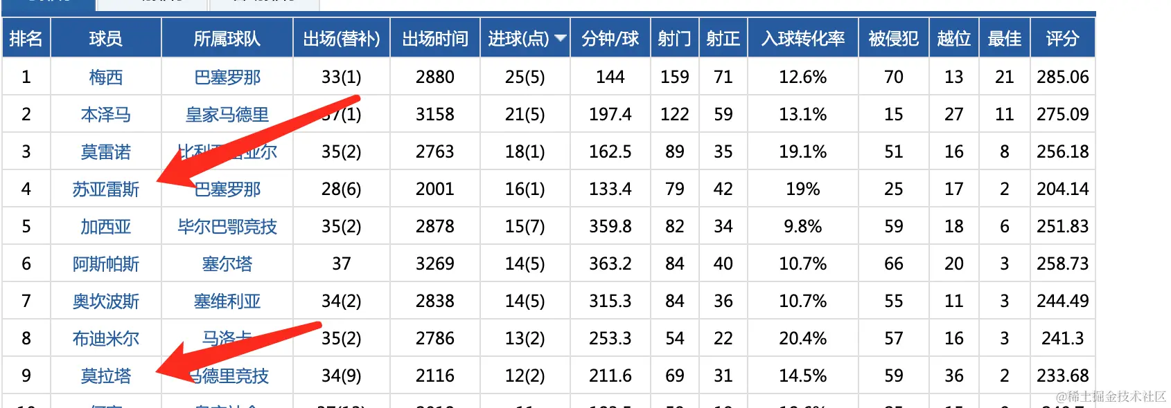 现在我们来抽取一些高阶数据,这里以进球、转换率和助攻作为特征样本,当然了,如果愿意,也可以添加一些别的特征,这里只是简单演示一下,但是需要注意一点,数据建模只有有限的参考价值,因为球员的个人因素如:球员国籍,球员丑闻,球员个人目标定位(或期望值),球员伤病史及严重程度等等,这些都是没有参考数据的。