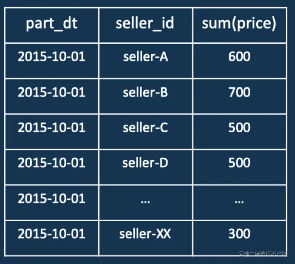 我们先从一个典型的TopN应用场景入手,在电商平台做数据分析的时候我们想要获取可能会经常需要查看销售额靠前100的卖家是哪些,SQL查询示例如下: