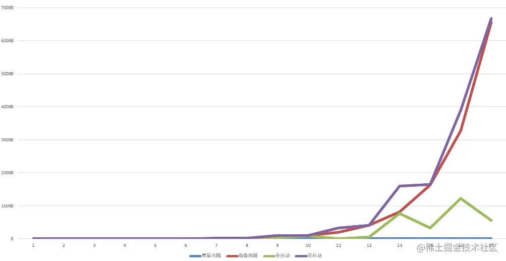 策略6.等抖动。在「指数间隔」和「全抖动」之间寻求一个中庸的方案,降低随机性的作用。适用场景和「全抖动」一样。