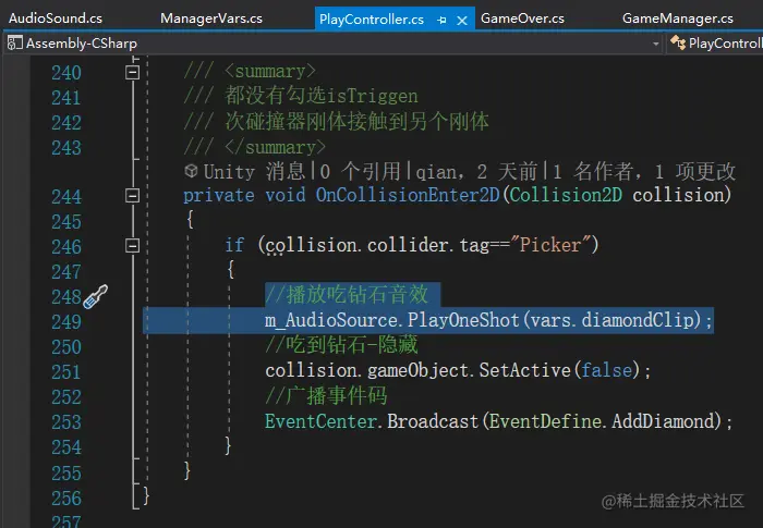 在需要播放的时候使用m_AudioSource.PlayOneShot(vars.fallClip);