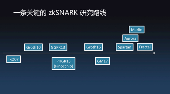 这个过程看似简单,但zkSNARK的研究是基于许许多多的密码学家的苦苦探索,路线可以追溯到IKO07(2007年),2010年Groth有了初步想法,重点的突破是2013年,而Groth16的改进方案是现在业界最流行的零知识证明算法。还有一些非常新改进方案如:Marlin、Aurora、Spartan、Fractal,都是由GGPR13算法不断改进一路发展过来的。