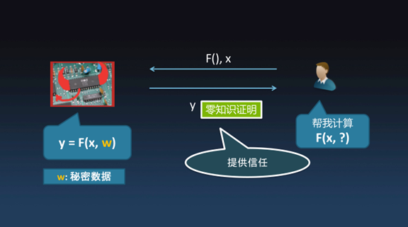 在零知识证明中一定有像右边这样一个人,我们把他称之为Bob,左边可能是一台不受信任的机器。此时,假如说Bob有一个计算任务要交给左边的机器来运行,但这机器本身可能会受人控制。Bob需要把一个“F()”函数作为计算任务,带上输入“X”,交给左边机器,让它去完成这个计算任务。因为这个计算过程发生在左边的机器上,对于Bob来说并没有见证整个计算过程,那Bob凭什么相信计算结果Y=F(X,W)的式子能成立呢。并且运算过程中掺入了一些只有左边机器知道的秘密数据(W),而Bob并没有W,因而Bob是不能通过复现计算过程来获知计算结果是否正确。在这样的情况下,能不能让Bob还能相信计算结果是对的呢?