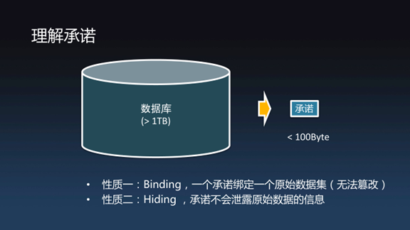 讲这个概念之前先要讲一个非常重要的密码学概念——承诺。如图,大家可以看到左边是一个数据库,这个数据库非常非常大,可能是超过1TB那么大,可以用密码学的手段把它变成很小很小的一段字节,大概小于100字节。不管这个数据库多大,最后承诺都可以压成不超过100字节这么大的数据。