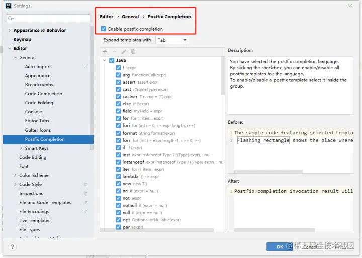 在聊接下来的技巧前,需要你必须开启Postfix Completion,见