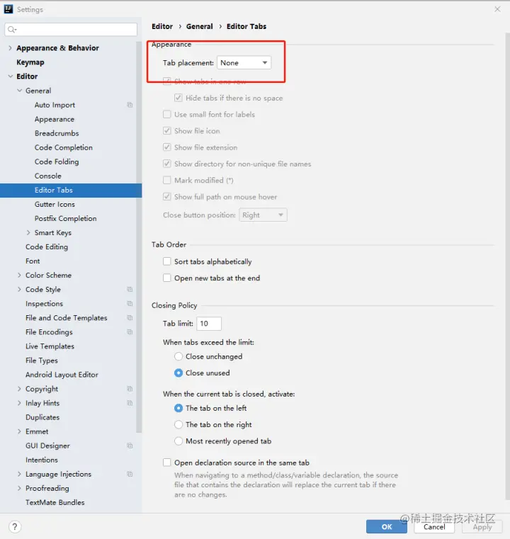 Ctrl+Alt+s 打开设置窗口,选择 Editor>Editor Tabs,关闭Tab,如下图