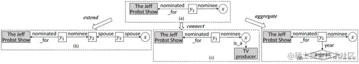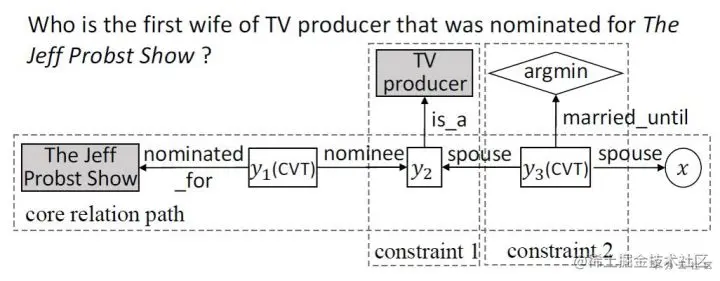 - 给定一个部分核心路径 (The Jeff Probst Show, nominated for, y1, nominee, y2),如果在y2上扩展一个关系,需要考虑KB中连接y2的所有关系,但是如果先加一个约束(is a, TV producer),将只考虑电视制片人被提名为xx show的人。