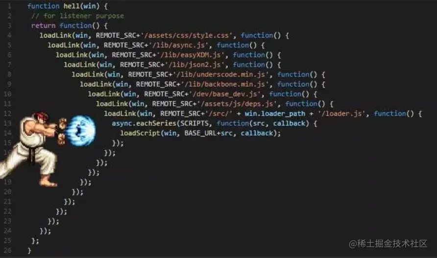 现在我们只是读取3个文件,就嵌套了3层回调函数,即使是这样,看起来也非常臃肿;假如我们要读取1000个文件,那么我们就要写上1000个嵌套函数!这就是回调地狱,写起来就像这个样子