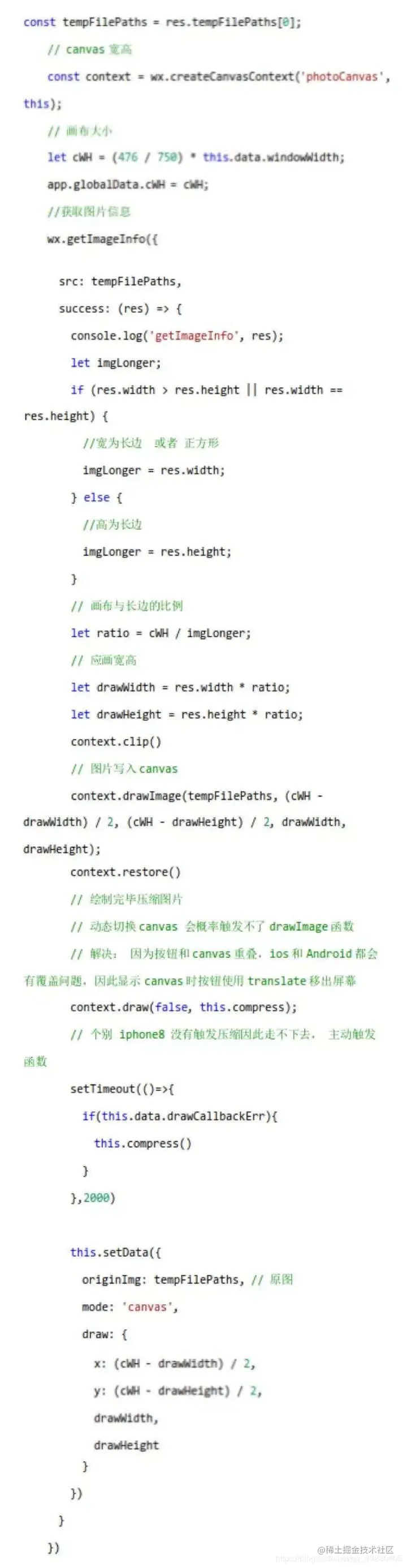结果再次证明,我们优化的重点应该就是图片上传,和图片识别这两个环节。这时,我们重点应该是控制图片的大小,因为经验告诉我们,这块是严重影响着文件的上传速度和识别接口的压力。所以,我们分析了一下源码。发现在小程序端,并没有针对用户拍摄或选择的图片进行必要的处理,导致不同的机型,所产生的图片大小会有明显的差异,那如何去抹平这种差异,把所有的机型表现都统一在同一起跑线上,所以,我们借助了canvas
