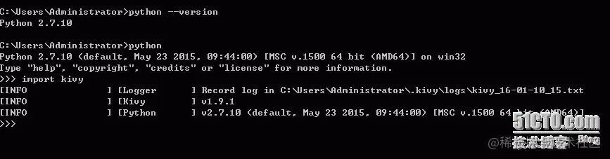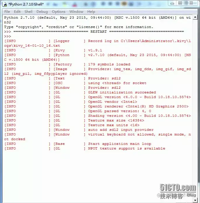 至此,安装就已经完毕了,值得注意的是64位系统没有开启虚拟化支持,在导入kivy的时候会报错,如果是64位系统就设置一下机器的BIOS,开启虚拟化支持吧。 注:这里只是kivy的运行环境,这样我就能直接在windows机器上直接调试了,怎么将代码编译成APK文件我们会在后面讲到。