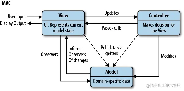 - 监听用户交互事件,更新Model