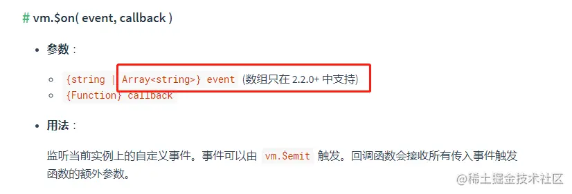 // 第一种:以数组方式监听事件(数组只在 2.2.0+ 中支持)