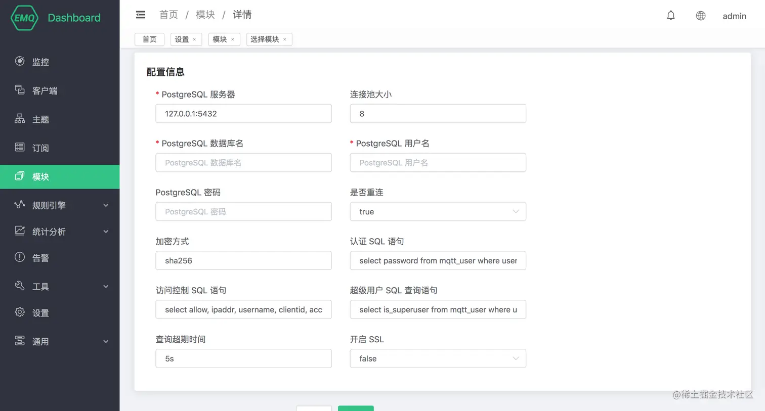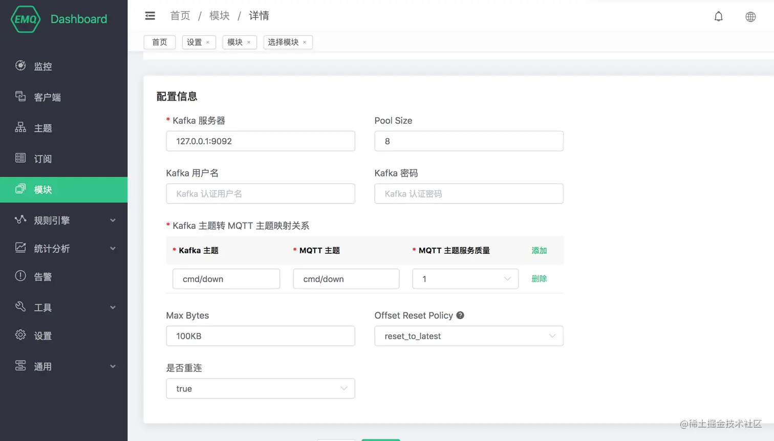 - 插件配置上手难度高:模块通过 Dashboard 提供了可视化配置,降低上手难度;部分配置项支持热更新,比如用户可以方便地添加 MQTT-SN 监听端口、更改认证 SQL 语句。