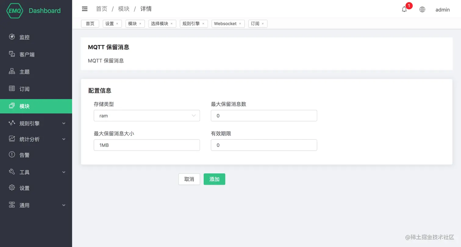 用于 EMQ X 中 MQTT 保留消息的管理,可以配置存储位置、有效期、消息大小等参数。禁用此模块且没有启用其他保留消息功能,EMQ X 将不支持保留消息。