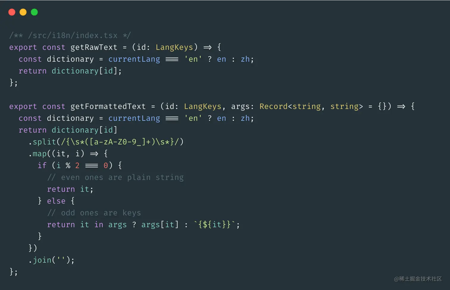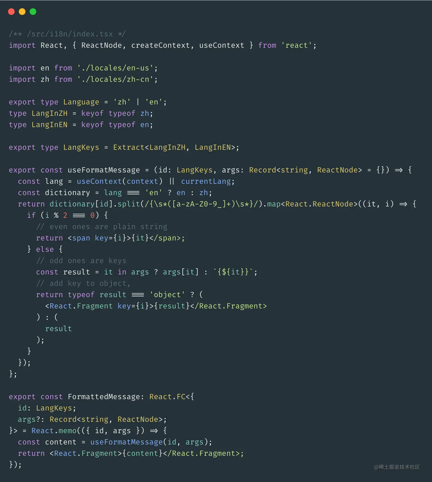 <FormattedMessage/>组件的实现代码可以看到,核心代码是调用了自定义hook(即useFormatMessage方法),该方法利用了字符串的split方法能使用正则来分割使结果中包含分隔块的特性(传送门 👉: MDN文档),并使用useContext方法获取到<IntlProvider/>组件存放的语言版本。 - 在组件中使用: