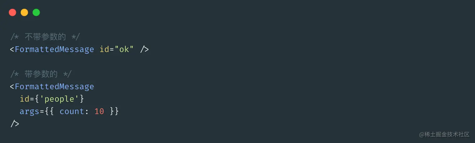 <FormattedMessage/>组件支持传入id(必填)和参数args(可选),相关代码如下:- 从