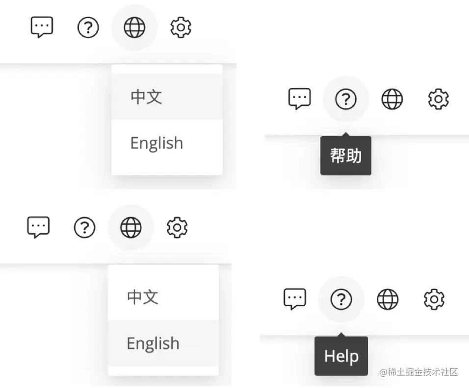 react-intl库只能在组件中实现国际化,不支持在普通js对象中使用。为了解决这个问题,我们可以在全局存放当前的语言版本currentLang,当切换语言版本时,对该全局变量进行更新,对 js 文件提供的 api 只需要根据当前currentLang值选取相关的语言版本dictionary,并通过传入的key进行文案翻译(取value)即可。