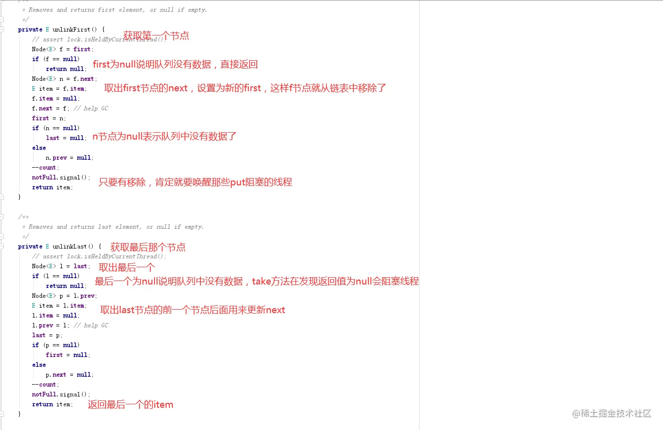 同样从队列中获取移除的方法最终都是调用的unlinkFirst、unlinkLast方法,方法源码如下图: