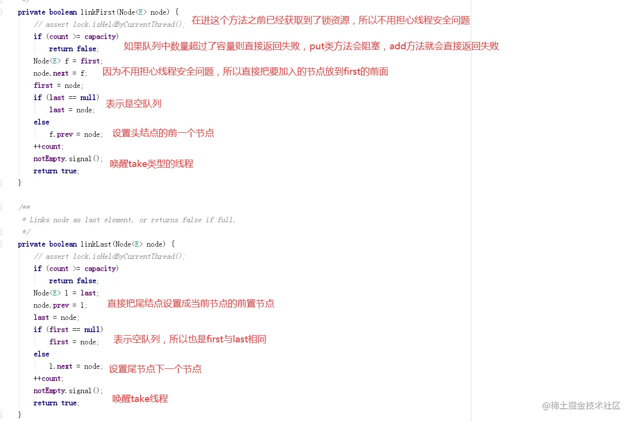 通过对几个add、offer 、put跟进源码发现他们最终调用的是linkLast方法,而这几个以Last结尾的方法调用的是linkFirst,所以我们直接看linkLast、linkFirst方法的源码,源码如下图: