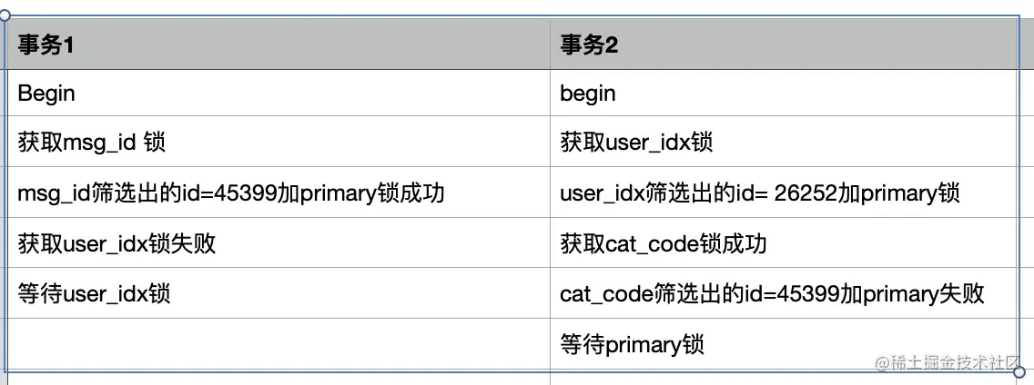 事务1由于索引合并的影响,先对索引msg_id加index锁,再对msg_id索引扫描结果record加primary锁成功,持有了record:0x0000b157(id=45399)的primary锁,此时开始获取user_idx索引锁.
