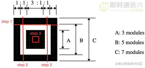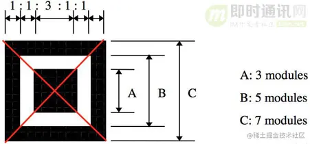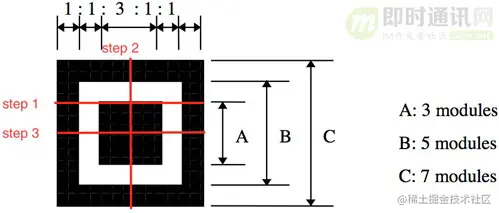 在一张图片中,要找到二维码,关键在找二维码特征定位点: