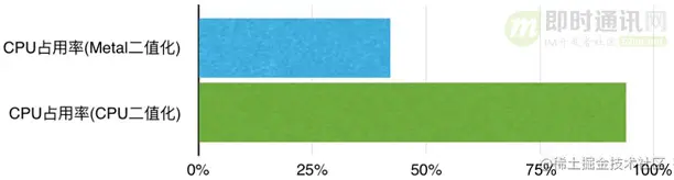 可以看出,在图像二值化方面 Metal 有相当高的优势,相比原来的单纯 CPU 处理快了接近 150%, 同时降低了近50个百分点的CPU资源。