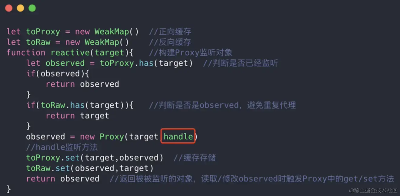 其中let toProxy = new WeakMap(),WeakMap是弱引用,key为对象,用于缓存代理的target,let toRaw = new WeakMap(),用于缓存observed,避免重复代理
