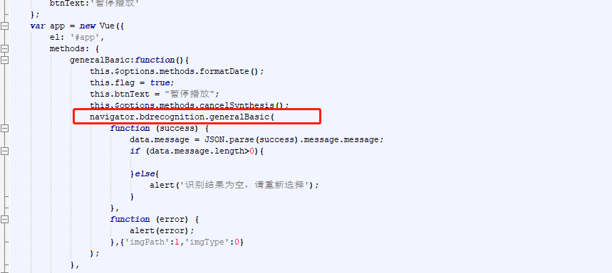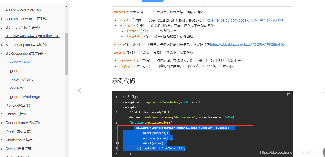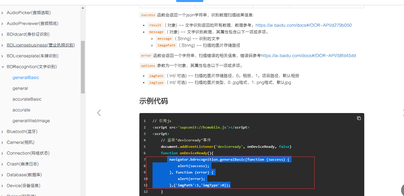 先查看这几个插件的api(www.yd-mobile.cn/#/book?acti…),看看都有什么功能接口,如BDRecognition插件,调用