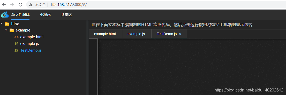 在单文件调试example文件夹下新建js文件,如TestDemo.js: