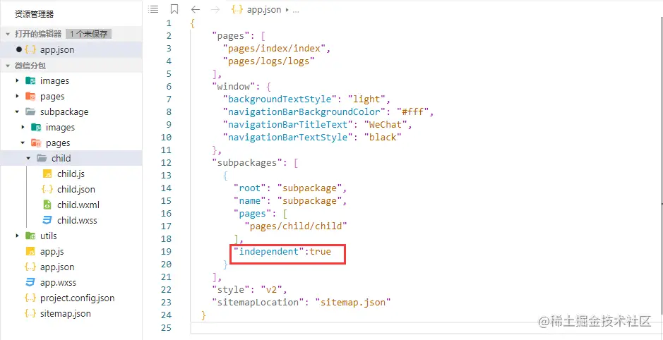 我们只需在app.json 的 subpackages 字段中对应的分包配置项中定义 independent 字段声明对应分包为独立分包。