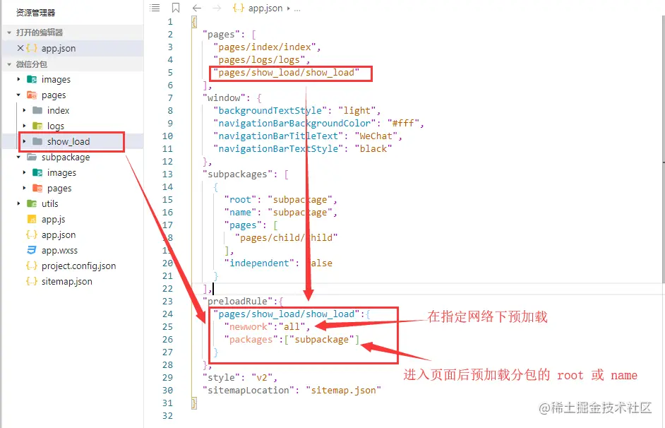 预下载分包行为在进入某个页面时触发,通过在 app.json 增加 preloadRule 配置来控制。例如:当进入主包 show_load 页面后,预加载分包 subpackages