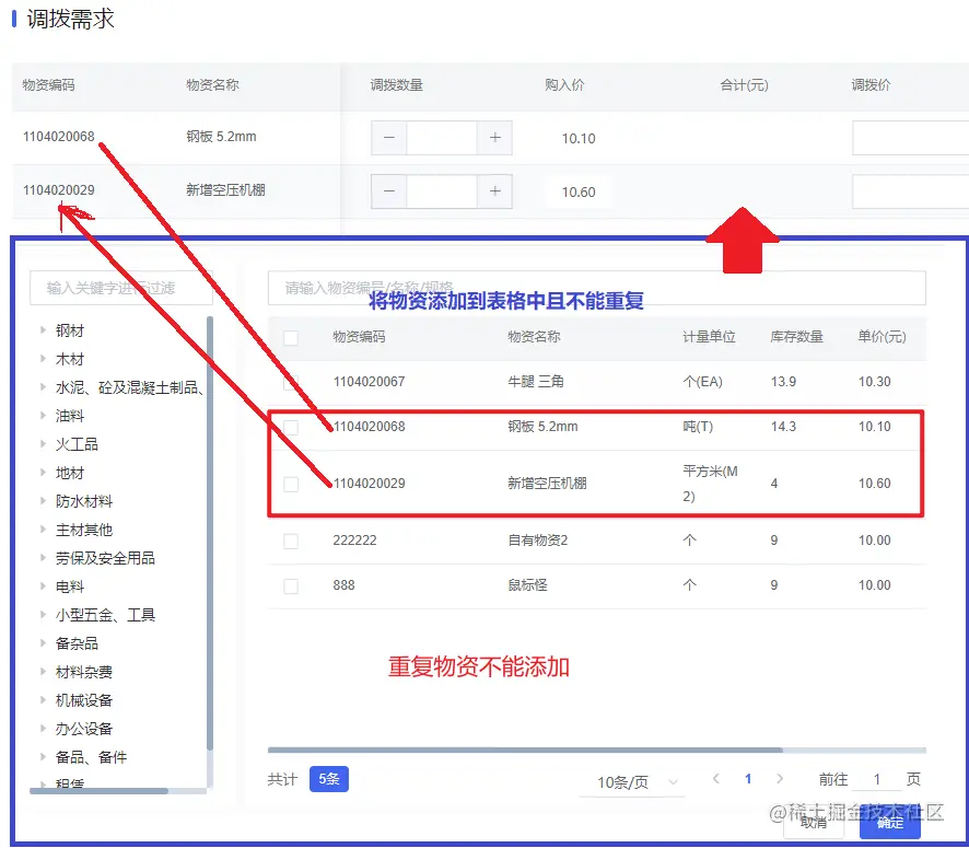一个常见的需求就是,对于一些能够添加数据的表格,当我们往里面添加数据的时候往往会校验此时表格中是否与我们选中的数据相同。比如说:添加物资,我们判断是不是相同数据大多数时候是根据物资的ID去辨别的,即是说当我们选中的物资他的ID与表格中存在的物资ID相同的时候我们就需要告知用户他已经添加过这条物资了,并且自动将这条物资过滤掉,只将不重复的物资添加进表格。这样的功能其实也就是一个对象数组的去重问题。