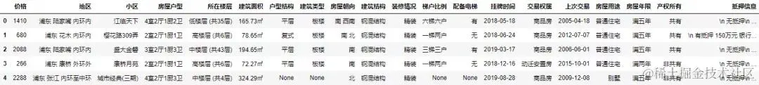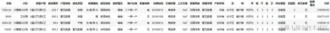 首先我们看一下爬取的数据。维度不是太多,但是有些列我们可以拆分,例如地区、所在楼层、抵押信息等。