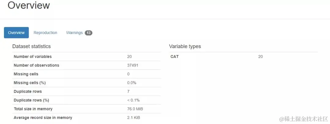 根据报告内容我们可以看到本次数据总共有 37491 行,20 列,存在 7行重复,重复占比小于 0.1%,报告继续下拉可以看到每一列的统计情况。 我们需要清洗的几点: