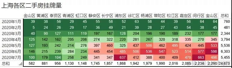 从交叉表来看,2020年1月1日至2020年7月23日链家网上已经挂牌 24673 套二手房。其中嘉定、闵行、宝山等区的抛压较大,7月浦东的挂牌量激增。 所以验证了上面外环外抛售房源较多的现象。