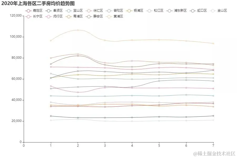 用折线图来看看趋势,好像各区都挺平缓的,浦东新区倒是在四月份之后有所上涨,虹口区在七月也有一小波上涨。