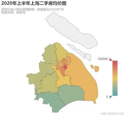 is_show=False)).set_global_opts(tooltip_opts=opts.TooltipOpts(formatter="{b}:{c}元/平米"), visualmap_opts=opts.VisualMapOpts(max_=100000, pos_right='5%', pos_bottom='20%', is_calculable=True), title_opts=opts.TitleOpts(title="2020年上半年上海二手房均价图", subtitle="崇明区缺少相应房源数据;数据截至2020年7月\n数据来源:链家网 "), toolbox_opts=opts.ToolboxOpts(), legend_opts=opts.LegendOpts(is_show=False)).render_notebook()