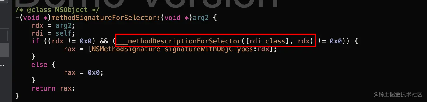 如果类中未实现methodSignatureForSelector:,在慢速查找的循环查找imp中可知会遍历父类,并在父类中进行消息转发,最终会找到基类NSObjec,通过Hopper查看NSObject的methodSignatureForSelector:实现