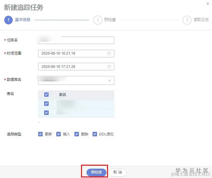 4. 在详情页面单击“新建追踪任务”。系统弹出新建追踪任务窗口,根据提示填写任务名、时间范围等信息,选择追踪类型,确认无误后单击“预检查”。