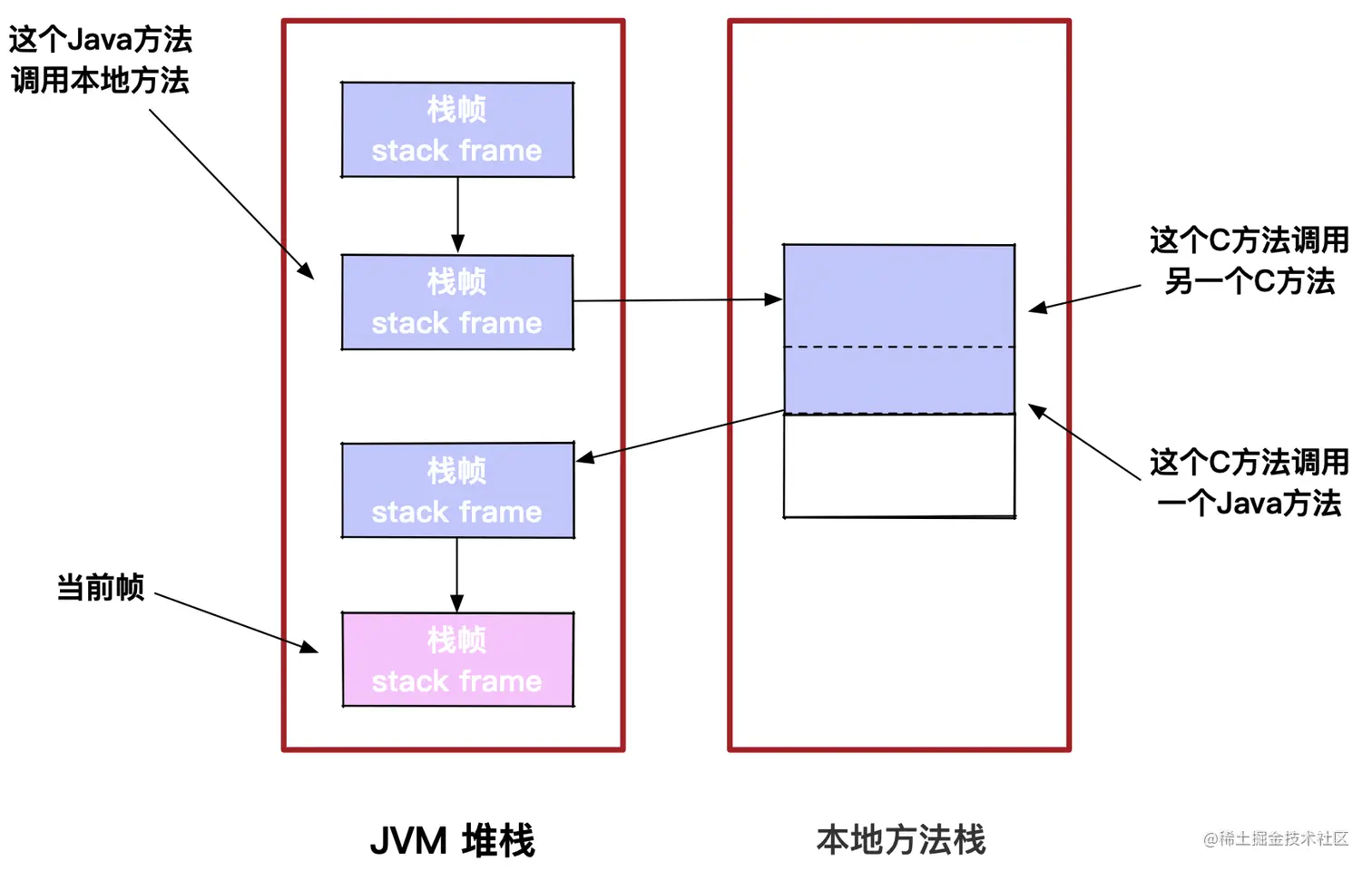 - 本地方法可以通过本地方法接口来访问虚拟机内部的运行时数据区。