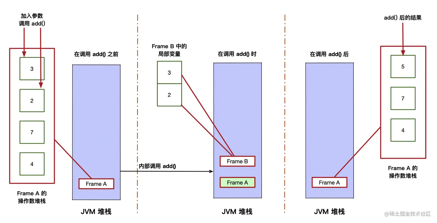 在functionA()内部,Frame A是当前帧并且是堆栈中顶部的帧。在内部调用add()的开始处,将新的帧(Frame B)放入堆栈中。这时Frame B称为当前帧。通过pop出Frame A的操作数堆栈来填充Frame B的局部变量数组。add()完成后,Frame B被销毁,Frame A再次成为当前帧。add()的结果放在Frame A的操作数堆栈上,以便于functionA()可以通过pop其操作数堆栈来使用它。